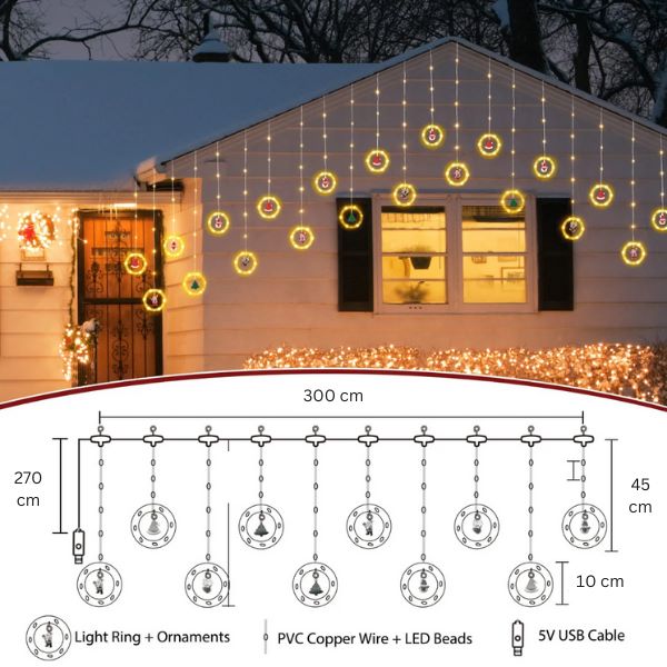 Jemné trblietavé svetlá, starostlivo umiestnené v priehľadných kruhoch, vytvárajú očarujúcu atmosféru a zároveň vrhajú žiarivú žiaru na zavesené figúrky.